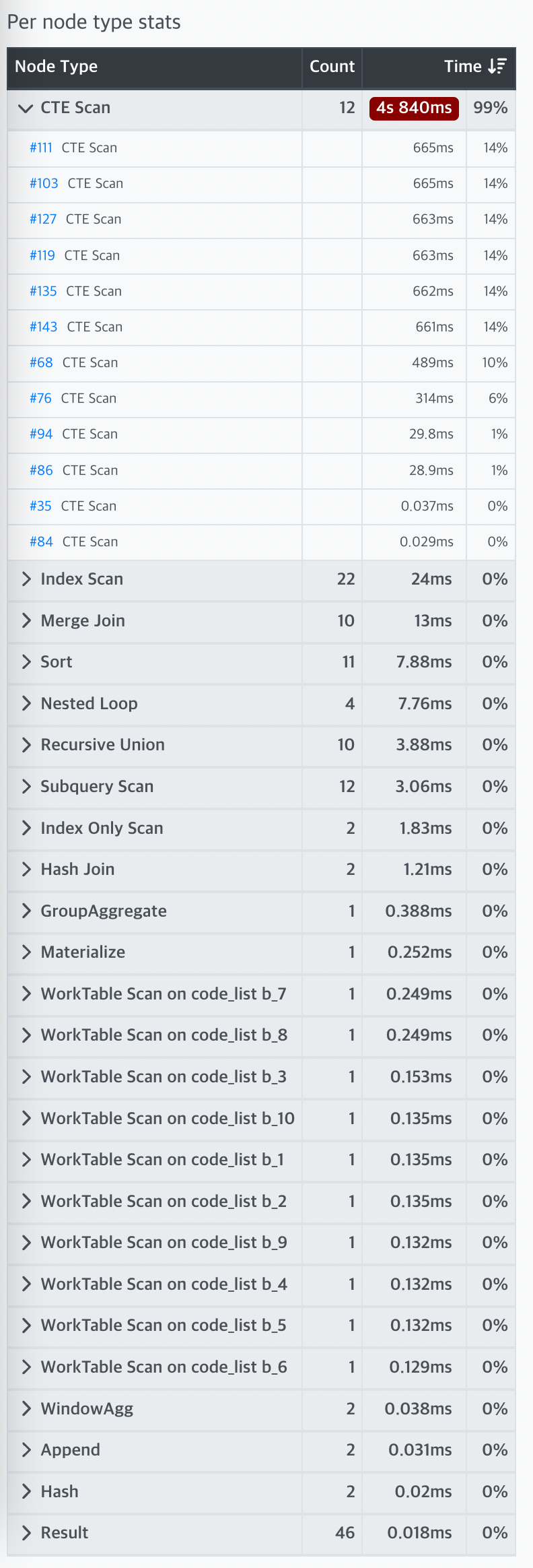 WITH TMP_QD_POLICY AS ( SELECT '010101' AS TOT_GENRE UNION ALL SELECT '010103' AS TOT_GENRE UNION ALL SELECT '010107' AS TOT_GENRE UNION ALL SELECT '010117' AS TOT_GENRE UNION ALL SELECT '010130' AS TOT_GENRE UNION ALL SELECT '010131' AS TOT_GENRE UNION ALL SELECT '010132' AS TOT_GENRE UNION ALL SELECT '010201' AS TOT_GENRE UNION ALL SELECT '010202' AS TOT_GENRE UNION ALL SELECT '010203' AS TOT_GENRE UNION ALL SELECT '010204' AS TOT_GENRE UNION ALL SELECT '010207' AS TOT_GENRE UNION ALL SELECT '010217' AS TOT_GENRE UNION ALL SELECT '010301' AS TOT_GENRE UNION ALL SELECT '010302' AS TOT_GENRE UNION ALL SELECT '010303' AS TOT_GENRE UNION ALL SELECT '010307' AS TOT_GENRE UNION ALL SELECT '010317' AS TOT_GENRE UNION ALL SELECT '010402' AS TOT_GENRE UNION ALL SELECT '070201' AS TOT_GENRE ) ,TMP_QD_EXCEPT AS ( SELECT '010101' AS EX_GENRE_SMALL , '85118001' AS EX_SERIES UNION ALL SELECT '010107' AS EX_GENRE_SMALL , '85104101' AS EX_SERIES UNION ALL SELECT '010117' AS EX_GENRE_SMALL , '0126146601' AS EX_SERIES UNION ALL SELECT '010201' AS EX_GENRE_SMALL , '11518201' AS EX_SERIES UNION ALL SELECT '010201' AS EX_GENRE_SMALL , '13111201' AS EX_SERIES UNION ALL SELECT '010201' AS EX_GENRE_SMALL , '6301301' AS EX_SERIES UNION ALL SELECT '010201' AS EX_GENRE_SMALL , '6720101' AS EX_SERIES UNION ALL SELECT '010202' AS EX_GENRE_SMALL , '6265401' AS EX_SERIES UNION ALL SELECT '010203' AS EX_GENRE_SMALL , '42305301' AS EX_SERIES UNION ALL SELECT '010203' AS EX_GENRE_SMALL , '7149801' AS EX_SERIES UNION ALL SELECT '010205' AS EX_GENRE_SMALL , '6438701' AS EX_SERIES UNION ALL SELECT '010205' AS EX_GENRE_SMALL , '83019801' AS EX_SERIES UNION ALL SELECT '010217' AS EX_GENRE_SMALL , '0093008801' AS EX_SERIES UNION ALL SELECT '010217' AS EX_GENRE_SMALL , '0094448401' AS EX_SERIES UNION ALL SELECT '010217' AS EX_GENRE_SMALL , '0095144901' AS EX_SERIES UNION ALL SELECT '010217' AS EX_GENRE_SMALL , '0126146801' AS EX_SERIES UNION ALL SELECT '010217' AS EX_GENRE_SMALL , '0127023201' AS EX_SERIES UNION ALL SELECT '010217' AS EX_GENRE_SMALL , '42389401' AS EX_SERIES UNION ALL SELECT '010217' AS EX_GENRE_SMALL , '42485201' AS EX_SERIES UNION ALL SELECT '010217' AS EX_GENRE_SMALL , '72010501' AS EX_SERIES UNION ALL SELECT '010217' AS EX_GENRE_SMALL , '72011201' AS EX_SERIES UNION ALL SELECT '010217' AS EX_GENRE_SMALL , '82004801' AS EX_SERIES UNION ALL SELECT '010301' AS EX_GENRE_SMALL , '42601201' AS EX_SERIES UNION ALL SELECT '010301' AS EX_GENRE_SMALL , '85135701' AS EX_SERIES UNION ALL SELECT '010303' AS EX_GENRE_SMALL , '12817901' AS EX_SERIES UNION ALL SELECT '010317' AS EX_GENRE_SMALL , '11573801' AS EX_SERIES ) SELECT /*genre.base.genreQdExcptInsertData*/ TOTAL_CNT, RNUM, SERIES_ID_IMCS, SERIES_NAME, GENRE1, GENRE2, GENRE3, GENRE_NAME, GENRE_NAME2, GENRE_NAME3 FROM ( SELECT COUNT(A.SERIES_ID_IMCS) OVER() AS TOTAL_CNT, A.RNUM, A.SERIES_ID_IMCS, A.SERIES_NAME, A.GENRE1, A.GENRE2, A.GENRE3, A.GENRE_NAME, A.GENRE_NAME2, A.GENRE_NAME3 FROM ( SELECT ROW_NUMBER() OVER (ORDER BY GEN.SERIES_ID_IMCS DESC) RNUM, GEN.SERIES_ID_IMCS, MAX(GEN.SERIES_NAME) SERIES_NAME, GEN.GENRE1, GEN.GENRE2, GEN.GENRE3, GEN.GENRE_NAME, GEN.GENRE_NAME2, GEN.GENRE_NAME3 FROM TMP_QD_POLICY TMP_QD, TMP_QD_EXCEPT TMP_EX, ( SELECT GEN.SERIES_ID_IMCS, GEN.SERIES_NAME, CASE WHEN LENGTH(GENRE_CD) >= 2 THEN SUBSTR(GENRE_CD, 1,2) END AS GENRE1, CASE WHEN LENGTH(GENRE_CD) >= 4 THEN SUBSTR(GENRE_CD, 1,4) END AS GENRE2, CASE WHEN LENGTH(GENRE_CD) = 6 THEN GENRE_CD END AS GENRE3, GEN.GENRE_NAME, GEN.GENRE_NAME2, GEN.GENRE_NAME3 FROM ( SELECT SMAP.ALBUM_GROUP_ID AS SERIES_ID_IMCS, SER_MST.ALBUM_GROUP_NM AS SERIES_NAME, ASB.GENRE_LARGE GENRE_NAME, ASB.GENRE_MID GENRE_NAME2, ASB.GENRE_SMALL GENRE_NAME3, ( SELECT GENRE_CD FROM ( WITH RECURSIVE CODE_LIST(GENRE_CD, GENRE_PARENT_CD, LEVEL, PATH, CYCLE) AS ( SELECT GENRE_CD , GENRE_PARENT_CD , 1 , ARRAY[GENRE_NAME::TEXT] , false FROM imcsuser.PT_CD_GENRE_CD WHERE GENRE_TYPE = 'L' UNION ALL SELECT A.GENRE_CD , A.GENRE_PARENT_CD , B.LEVEL + 1 , B.PATH || A.GENRE_NAME::TEXT , A.GENRE_CD = ANY (B.PATH) FROM imcsuser.PT_CD_GENRE_CD A , CODE_LIST B WHERE A.GENRE_PARENT_CD = B.GENRE_CD AND NOT CYCLE ) SELECT GENRE_CD , ARRAY_TO_STRING(PATH, ';') AS GENRE , LEVEL FROM CODE_LIST ) A WHERE GENRE = COALESCE(GENRE_LARGE, '') || CASE WHEN NULLIF(GENRE_MID,'') IS NULL THEN '' ELSE ';' || GENRE_MID END || CASE WHEN NULLIF(GENRE_SMALL,'') IS NULL THEN '' ELSE ';' || GENRE_SMALL END ) GENRE_CD FROM imcsuser.PT_LA_ALBUM_INFO AI , imcsuser.PT_LA_ALBUM_SUB ASB , imcsuser.PT_LA_ALBUM_GROUP SER_MST , imcsuser.PT_LA_ALBUM_RELATION SMAP WHERE 1 = 1 AND SER_MST.ALBUM_GROUP_NM LIKE ('%'||'시리즈'||'%') AND SMAP.ALBUM_ID = AI.ALBUM_ID AND AI.ALBUM_ID = ASB.ALBUM_ID AND SMAP.ALBUM_GROUP_ID = SER_MST.ALBUM_GROUP_ID AND SMAP.GROUP_TYPE = SER_MST.GROUP_TYPE AND SER_MST.GROUP_TYPE = 'S' )GEN )GEN WHERE 1 = 1 AND GEN.GENRE3 = TMP_QD.TOT_GENRE AND GEN.GENRE3||GEN.SERIES_ID_IMCS NOT IN (TMP_EX.EX_GENRE_SMALL||TMP_EX.EX_SERIES) GROUP BY GEN.SERIES_ID_IMCS, GEN.GENRE1, GEN.GENRE2, GEN.GENRE3, GEN.GENRE_NAME, GEN.GENRE_NAME2, GEN.GENRE_NAME3 ORDER BY GEN.SERIES_ID_IMCS DESC ) A )B WHERE B.RNUM BETWEEN 0+1 AND 0 + 50- 튜닝 쿼리